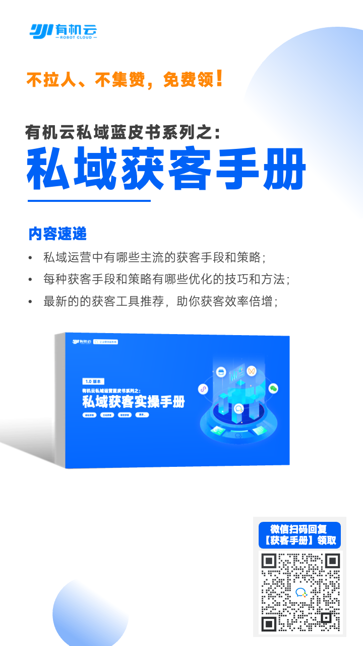 正因如此,有机云内容团队决定对私域获客这一课题做一番研究,并将我们的研究成果与服务客户的实际经验做一个结合,编著成一份资料,也就是本手册,与大家分享。