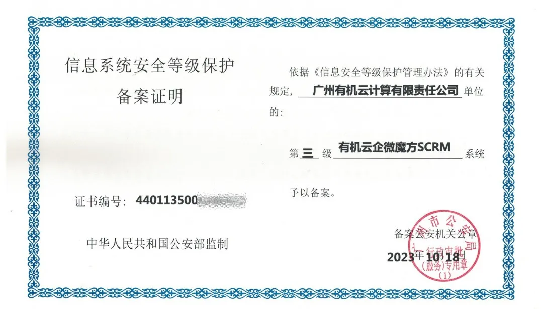 近日,关于“安全合规”的问题引起了整个私域圈的热议。毋容置疑,安全合规对于企业数字资产来说是至关重要的,有机云一直以来都用合规和安全的技术,为客户的私域赋能。以下是我们多年以来在安全合规上的努力和成果,足以证明我们对此的重视。