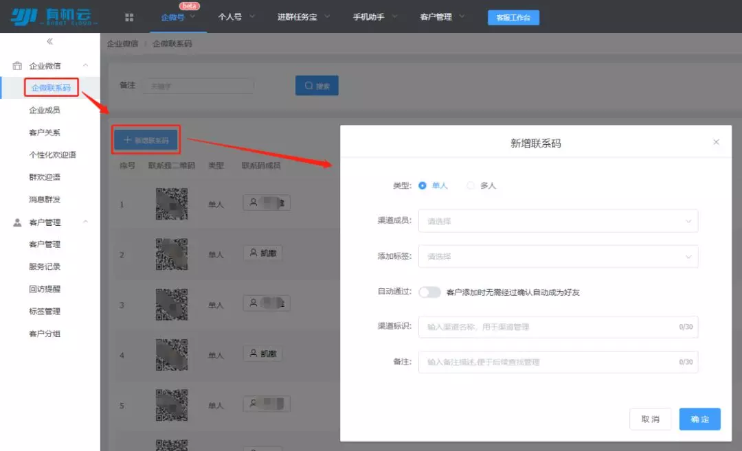 企微联系码-新增联系码-类型选择单人/多人-选择渠道成员-开启自动通过好友-设置渠道标识。