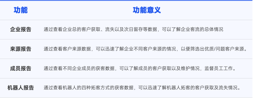 功能价值:通过查看企业成员的客户获取、流失和次日留存率,可以有效监控每位成员的客户获取及维护情况,有效监督员工工作。